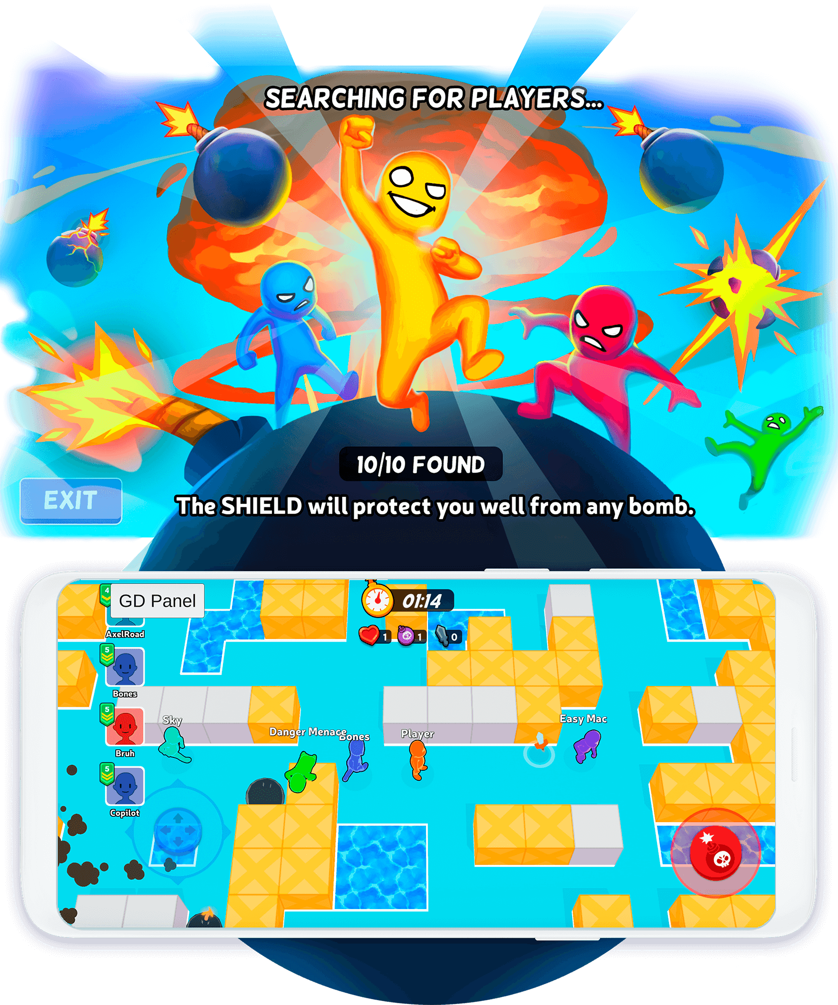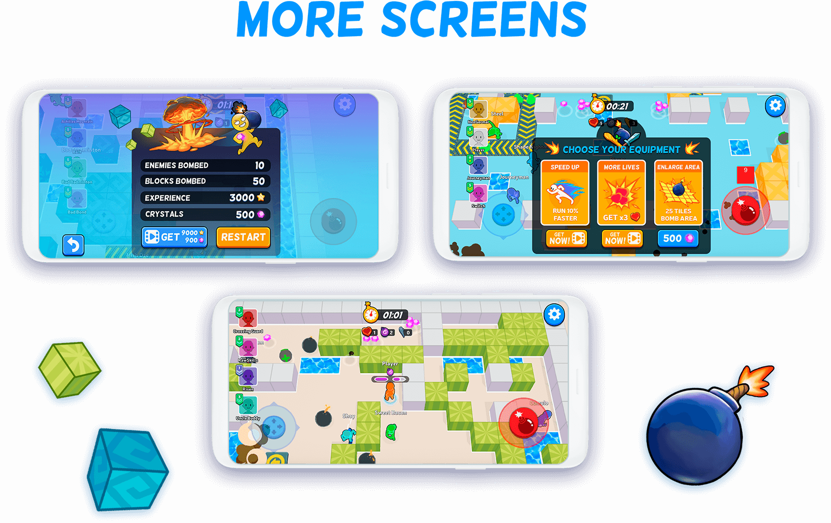 В начале игры у вас есть одна бомба ... Взрывая все подряд, вы можете найти бустеры. Используйте их без сомнений - уничтожайте врагов и станьте королем bomber.io!